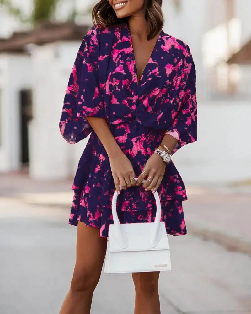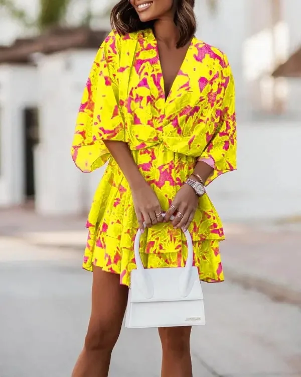 Adicione praticidade e charme ao seu guarda-roupa com este vestido estampado com decote V e mangas morcego – a peça que vai te acompanhar em todas as ocasiões com elegância e conforto.